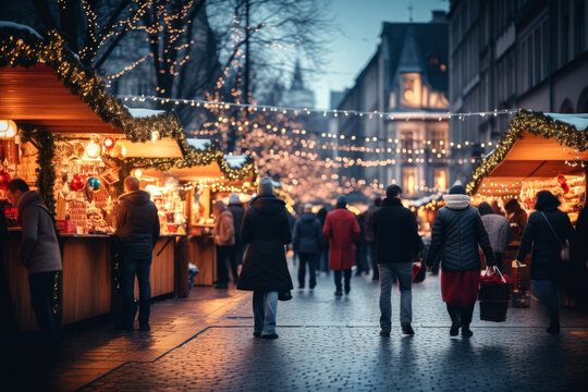 A festive Christmas market scene with colorful stalls, twinkling lights, and people enjoying the holiday spirit. bokeh background
