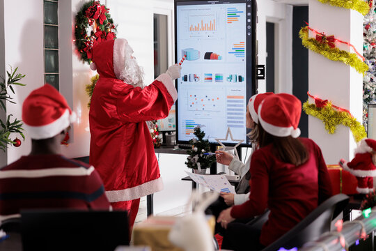 Trainer disguised in Santa Claus doing special occasion business meeting before Christmas holiday season. Employees in xmas clothing discussing financial quarterly results in festive decorated office