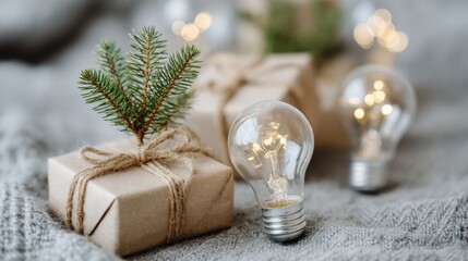 Festive flatlay with glowing string lights, wrapped gifts, ornaments and hud graphics