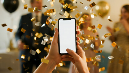 Faceless hands holding a smartphone (blank screen) upwards amidst a shower of falling confetti