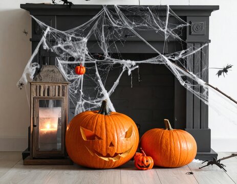 Spooky fireplace decorated with pumpkins, cobwebs, and spiders