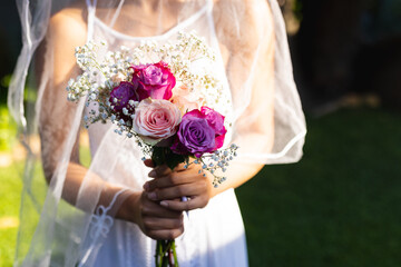 Midsection of african american woman wearing wedding dress and holding flowers during wedding day