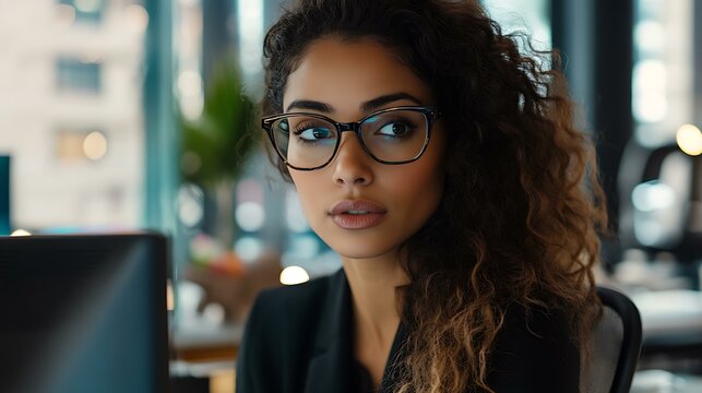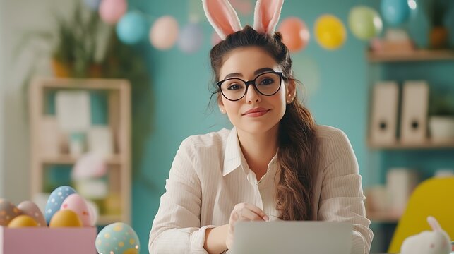 Latina business executive wearing glasses, focused on analyzing stock trends at a sleek modern workspace with festive Easter touches