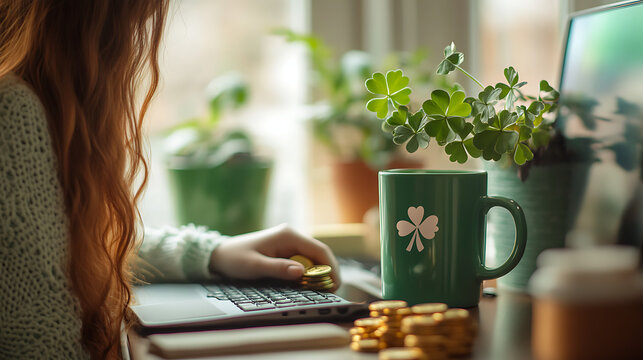 Latina executive in a well-lit workspace, attentively examining revenue growth statistics, workspace subtly styled with festive Easter decor