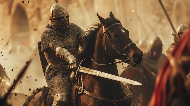 Medieval knight in full armor with sword on horseback during a fierce battle, showcasing epic combat amid a historical war setting.