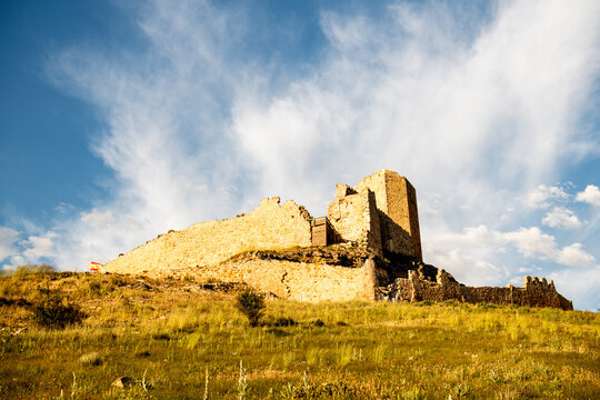 Medieval building illuminated by the setting sun and blue sky with clouds. Ruins of Hrusov Castle, an ancient feudal castle located in West Slovakia near city Nitra. History old Hungary and Austria.