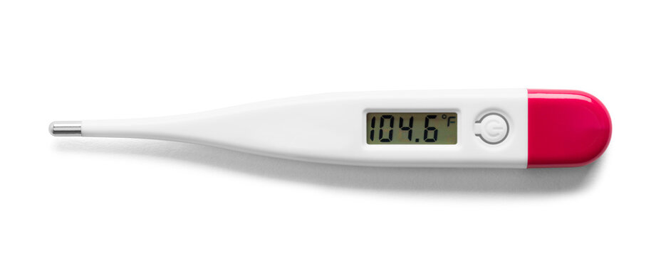 Close-up thermometer.  Mother measuring temperature of her ill kid. Sick child with high fever laying in bed and mother holding thermometer. Hand on forehead.