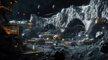 A dense asteroid field with mining operations and futuristic spacecraft.