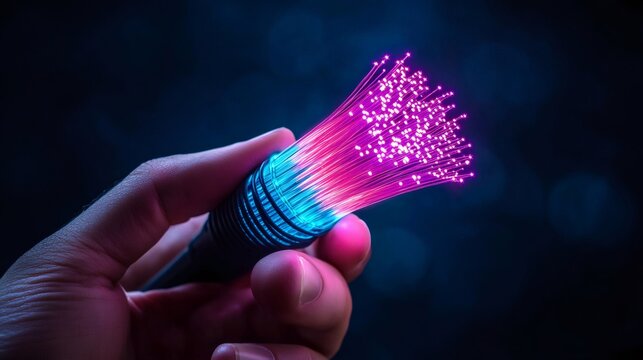 Hand holding fiber optic cable with futuristic lighting effects