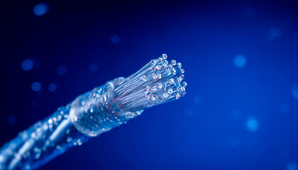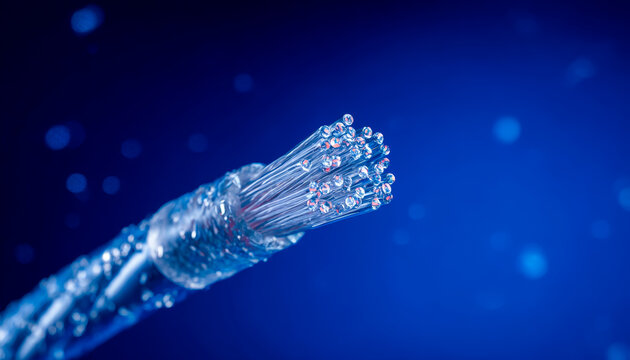 Close-up of fiber optic cable with illuminated strands against a dark blue background