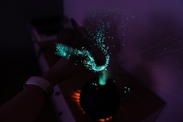 A deep pink dried rose in the colored light of a fiber optic lamp. Rose on the background of the threads of the lamp. Bokeh from the ends of the optical fibers.