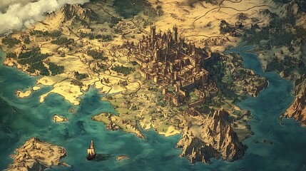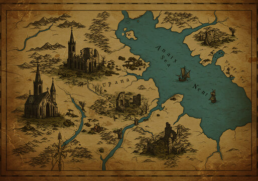 Aged Fantasy Map Illustration Featuring a Coastal Kingdom