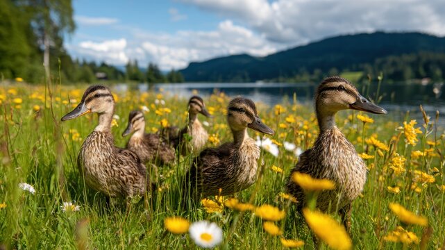 Majestic Wood Duck Vibrant Plumage on Grassy Field in Spring.