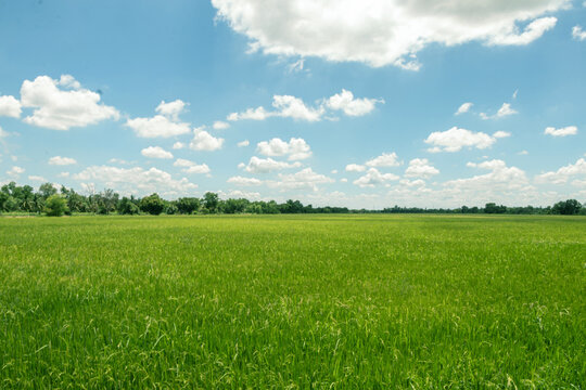 Rice fields,green tree and blue sky.Beautiful green field wallpaper.