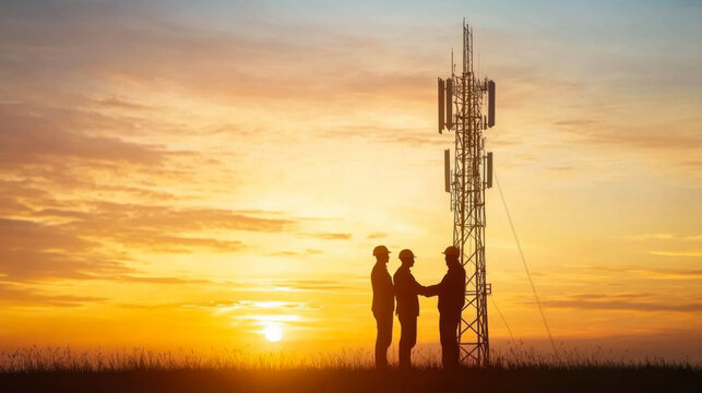Silhouette Engineer worker man and woman working wearing helmets doing field work telecommunication tower