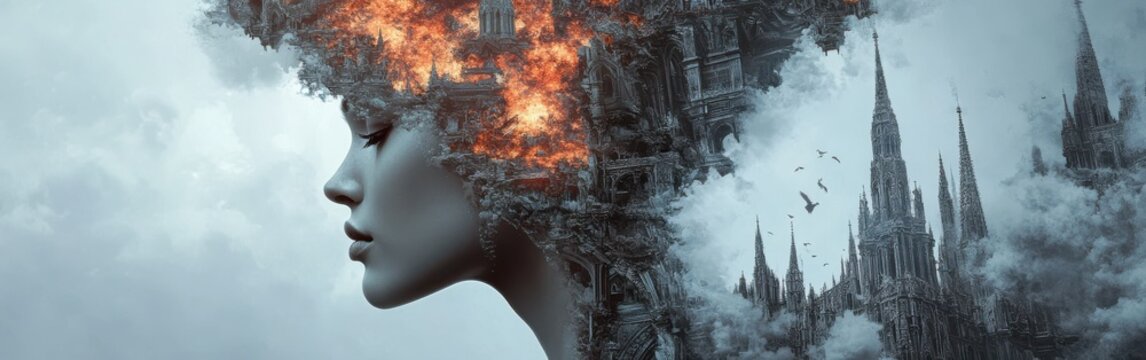 Surreal stone spiral staircase into spectacular fiery hell abyss