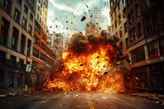 Massive explosion in a city street with flames and debris flying