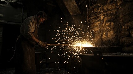 A blacksmith in action is captured working on heated metal at a forge. The sparks fly as he shapes the metal, dressed in work attire, in a dimly lit workshop.