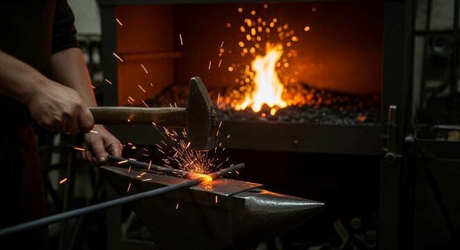 Artisan blacksmith shaping glowing steel with hammer in workshop