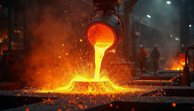 Molten steel pouring into a mold in a dramatic industrial setting with bright fiery arcs.