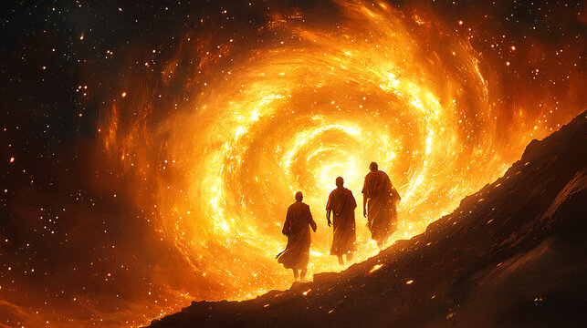 Shadrach, Meshach, and Abednego in the fiery furnace, depicted within a swirling nebula, highlighting their faith amidst trials