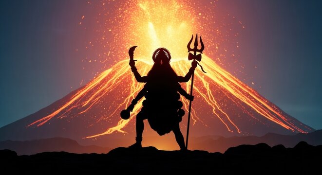 Powerful and intense depiction of a hindu goddess with fiery eyes and a golden crown amidst flames