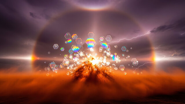 Main Subject Explodes with Vibrant Hexagon Light Orbs Over Fiery Horizon