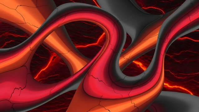 Abstract flowing ribbons of red and black against a fiery background with lightning