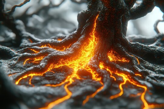 A mystical tree's roots glow with a fiery, hidden energy, revealing the powerful life force drawn from the earth below