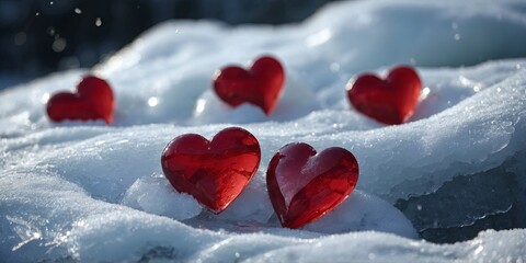 Hearts in the snow on an ice stone winter background for St Valentine's Day product display generation. AI generated.