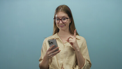 Young blonde woman wearing glasses holding smartphone and pointing finger in blue studio background; curiosity.