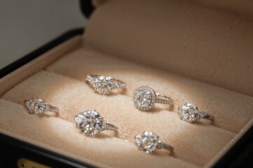 A collection of sparkling diamond engagement rings displayed in a luxurious jewelry box with soft lighting