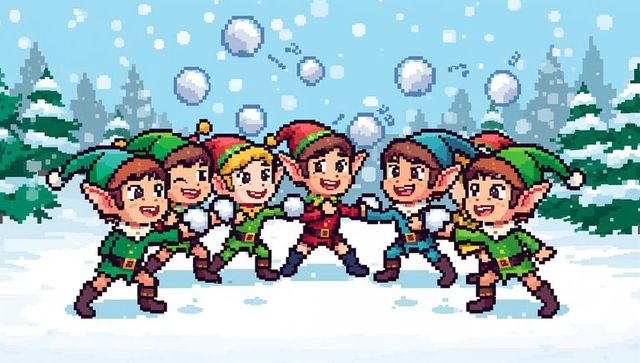 Pixel-art elves playing snowball fight in snowy winter forest retro 8-bit festive scene