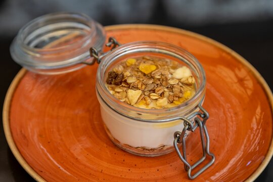 Closeup of a dessert made of hazelnuts and filberts in a small jar