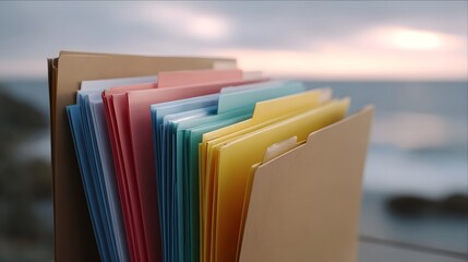 Colorful file folders are neatly organized outdoors by the ocean at dawn