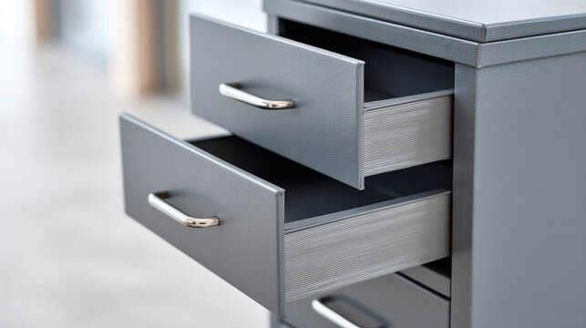 Open metal office cabinet drawers filled with stacked documents, featuring sleek silver handles and a clean, modern workplace background.