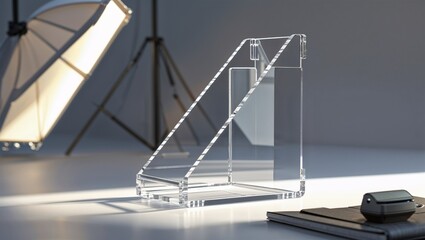 Photorealistic image of a acrylic magazine holder with angled opening and clear construction in a studio setting