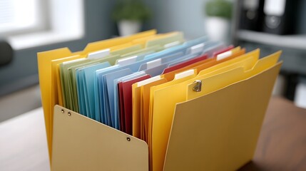 Close up of a desk organizer filled with colorful sorted file folders and tabs