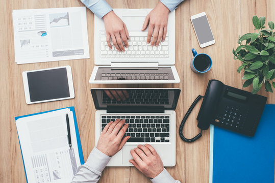business people using computers in content marketing concept with human hands using smart computers on computer screen background