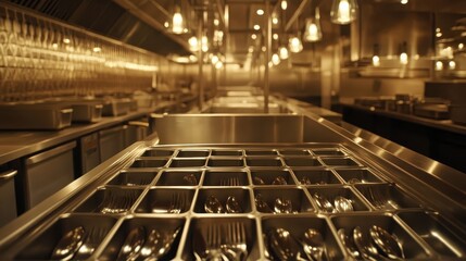 Commercial kitchen with neatly arranged silverware in compartments ready for service