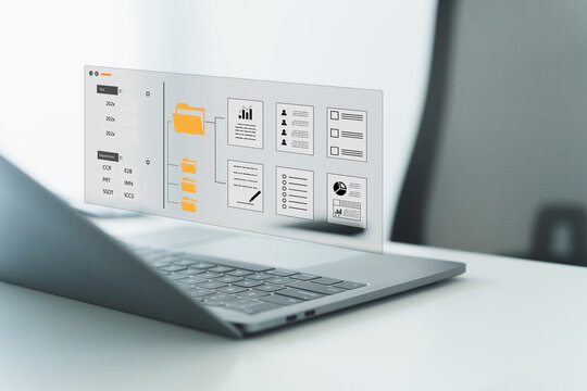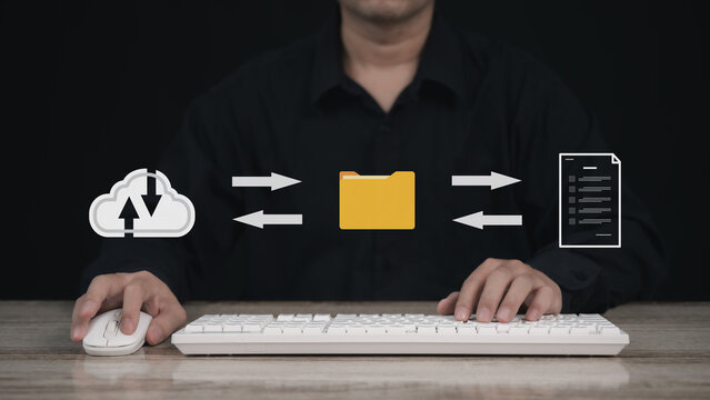 Encryption with file transfer concept : Business man use laptop for remote and download or upload folder document picture by internet connection with full access to remote files..