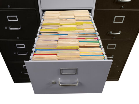 Healthcare pro in blue scrubs, stethoscope sorts through colorful files in cabinet drawer. Systematic organization of medical records, patient documentation, clinic administration. Focus on