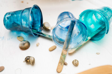 nfocused dirty (epoxy resin, acrylic paint) plastic cups of blue and birch flowers, with wooden sticks and scattered shells for DIY creativity