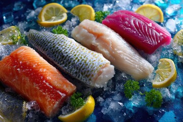 Fresh pangasius fillets with lemon and parsley on marble countertop
