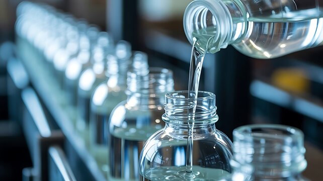 Liquid being poured into clear glass bottles on a production line pouring filling