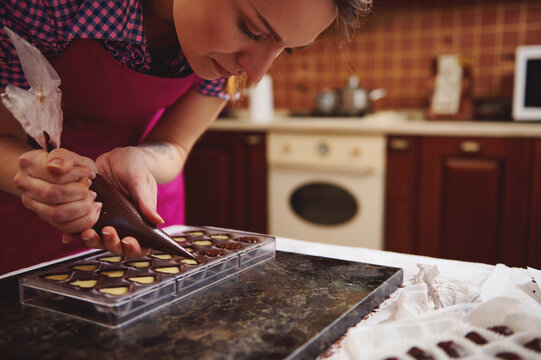 Chef or chocolatier makes sweet chocolates in a professional kitchen.
