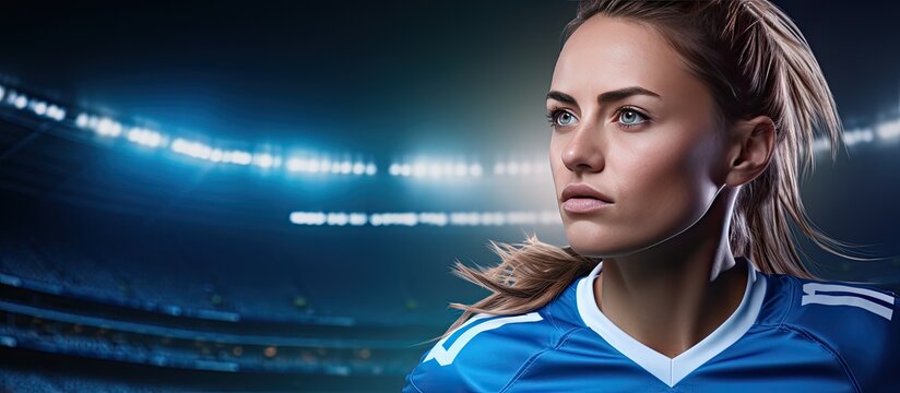 Digital composite of a successful football league final with a female player over a blue background