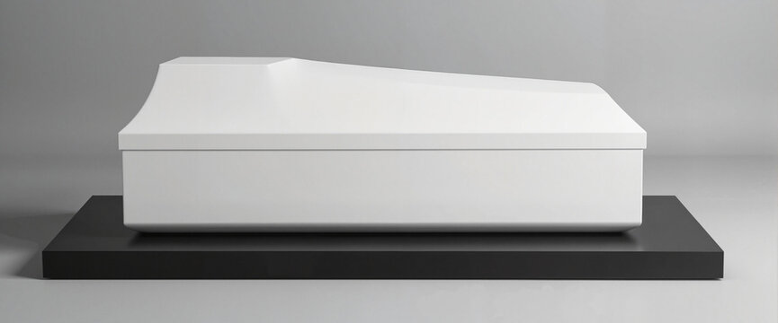 Minimalist white coffin on black platform, symbol of finality