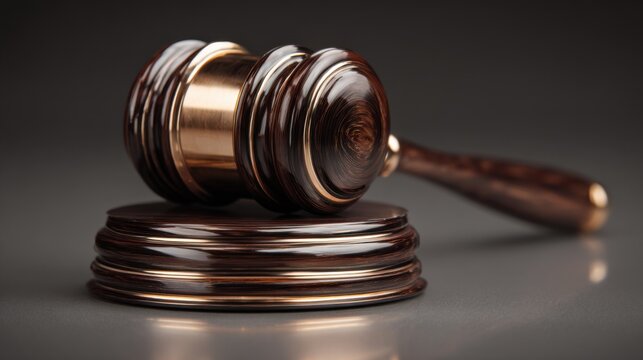 Closeup of a polished auctioneers gavel striking a wooden block symbolizing authority and finality in highstakes auctions with a sleek modern finish.