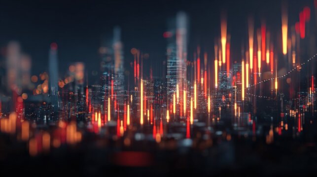 Abstract dark digital visualization with a financial theme, data lines & bars